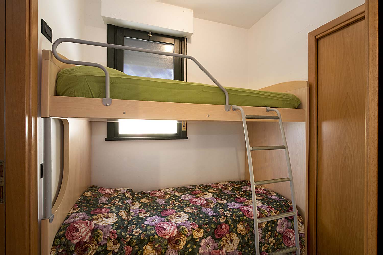 It has a living room with a kitchenette and single sofa bed, a bedroom with two single beds that can be joined, a bunk bed located in the hallway, and a bathroom with a shower stall.