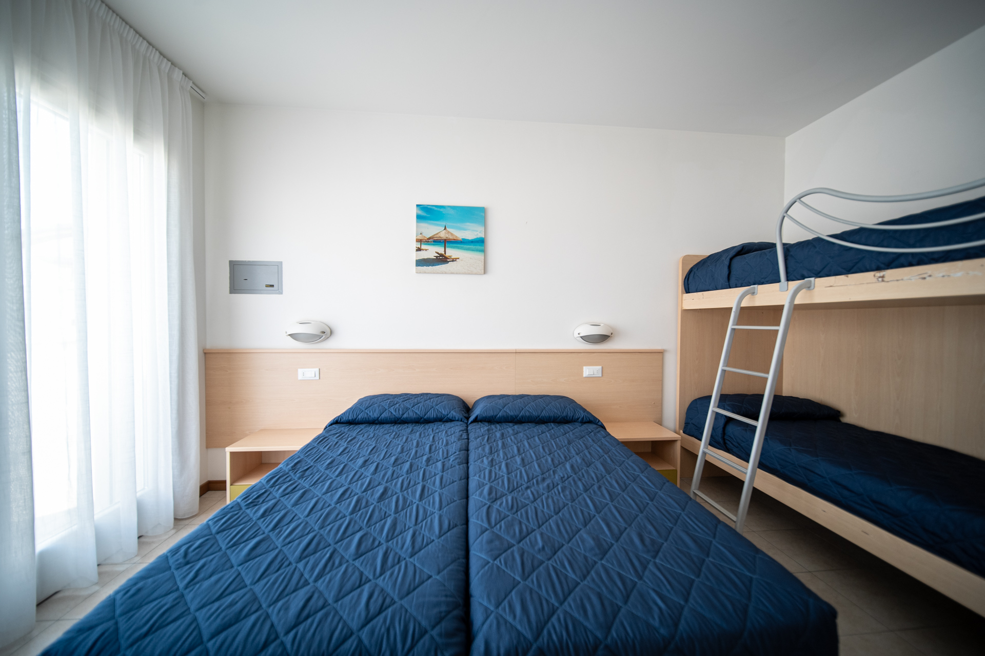 The living room with kitchenette and single sofa bed is the convivial heart of the house, while the bedroom houses two single beds joined to form a double and a bunk bed, ideal for younger children as well.