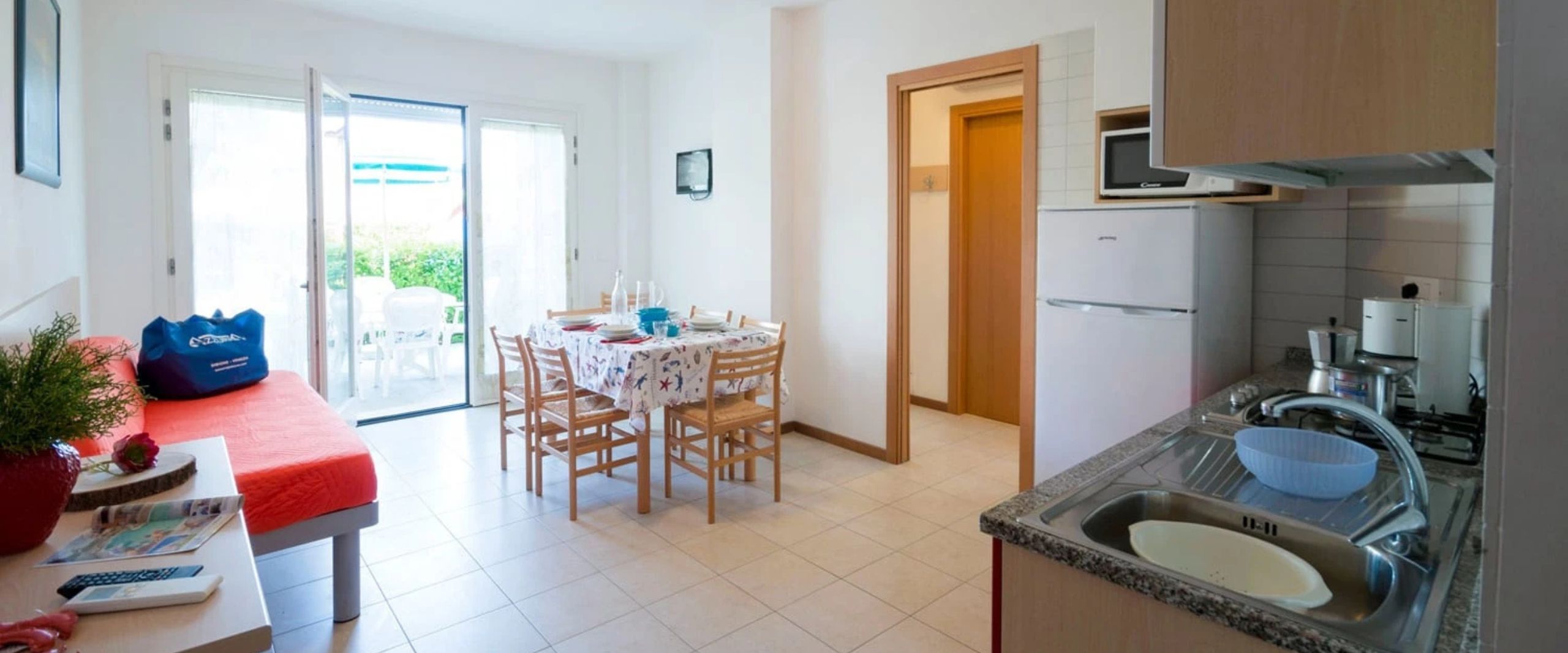 Accogliente e funzionale, questo bilocale per 4 persone è la scelta ideale per chi cerca una vacanza rilassante tra comfort e semplicità. Situato al piano terra con giardino/patio o al primo piano con terrazzo, l’appartamento dispone di un soggiorno con angolo cottura e divano letto singolo.