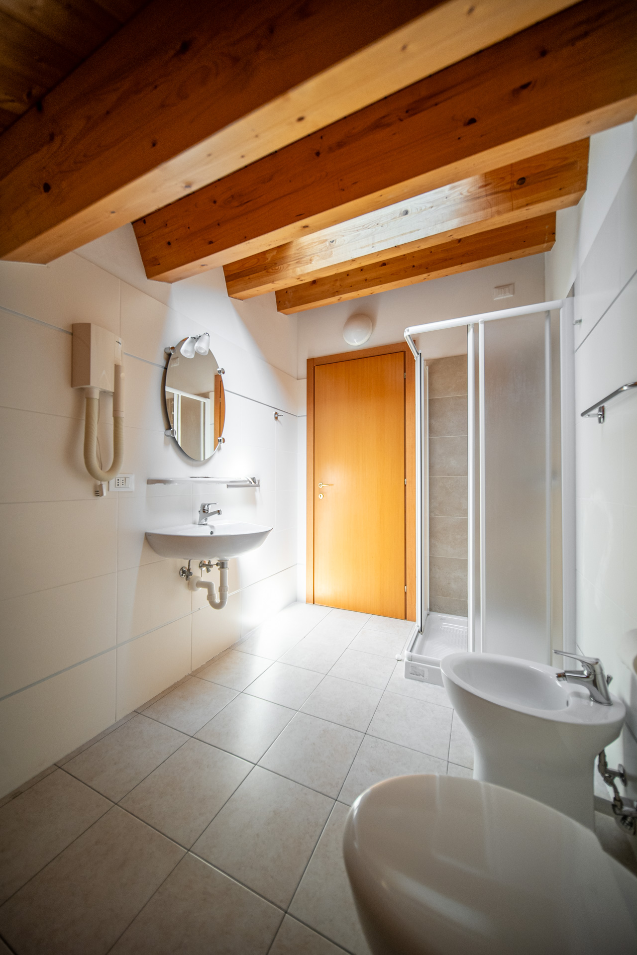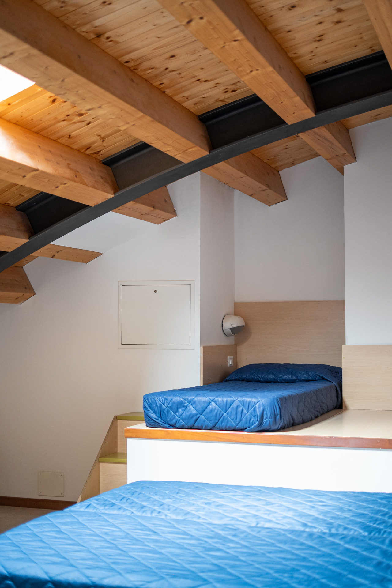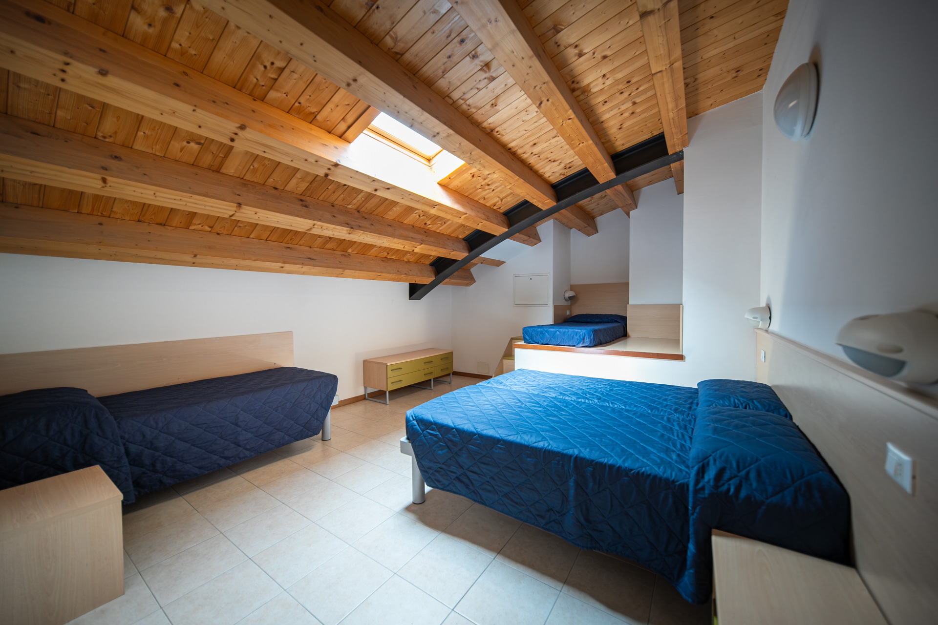 Il piano superiore, mansardato, ospita una spaziosa camera con quattro letti singoli, di cui due uniti a formare un matrimoniale, e un bagno con box doccia.
