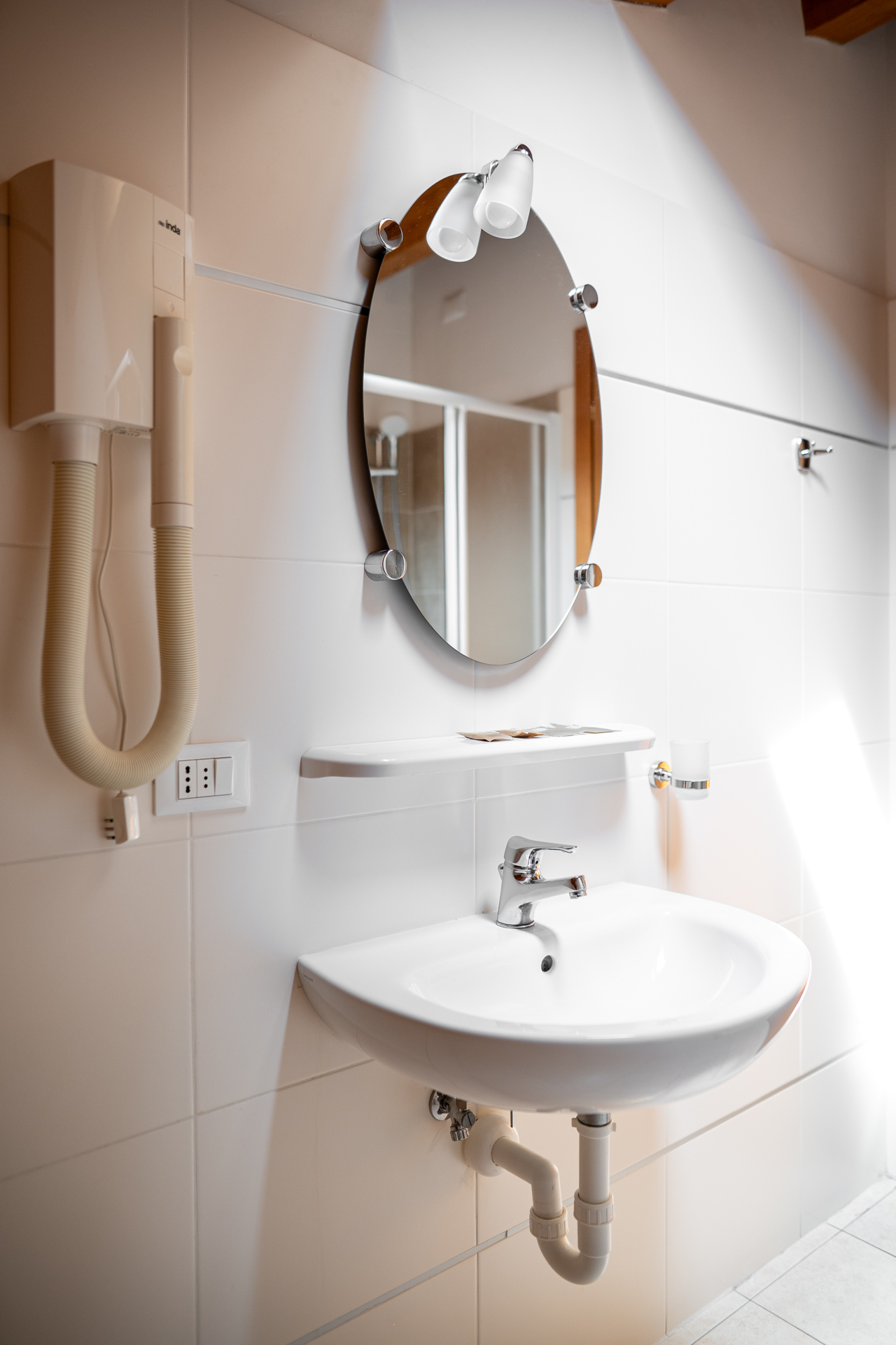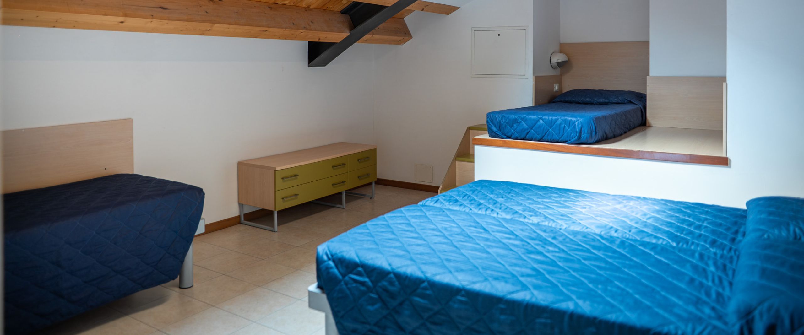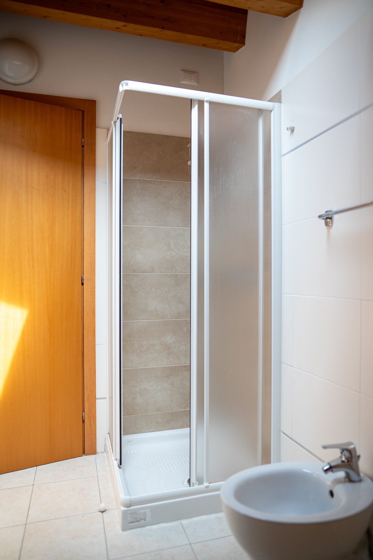 Il piano superiore, mansardato, ospita una spaziosa camera con quattro letti singoli, di cui due uniti a formare un matrimoniale, e un bagno con box doccia.