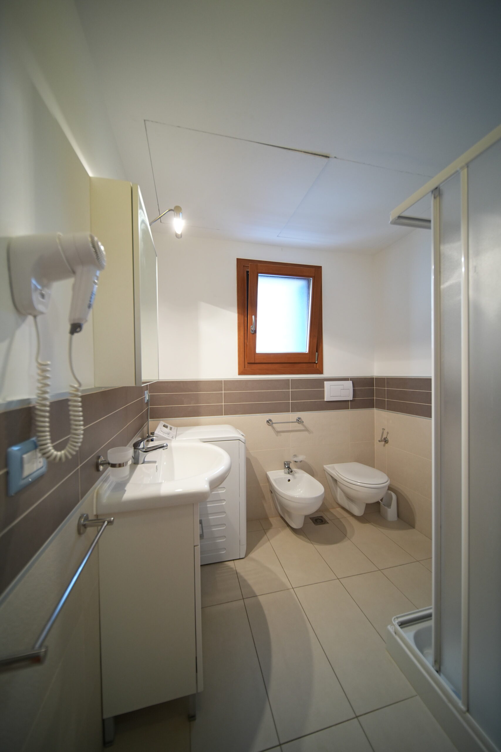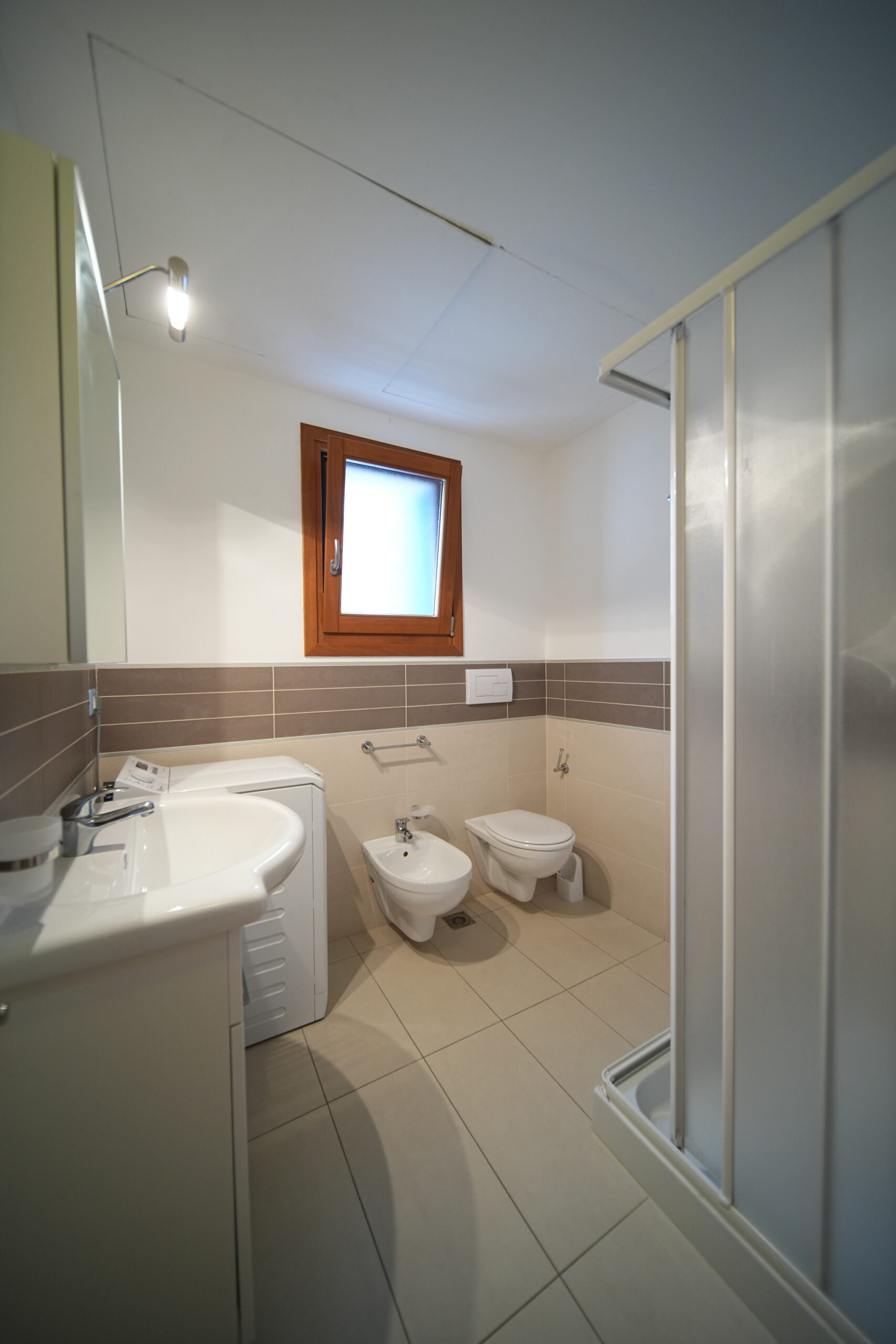 Al piano terra si trovano un accogliente soggiorno con angolo cottura e divano letto doppio, e un primo bagno con box doccia.
